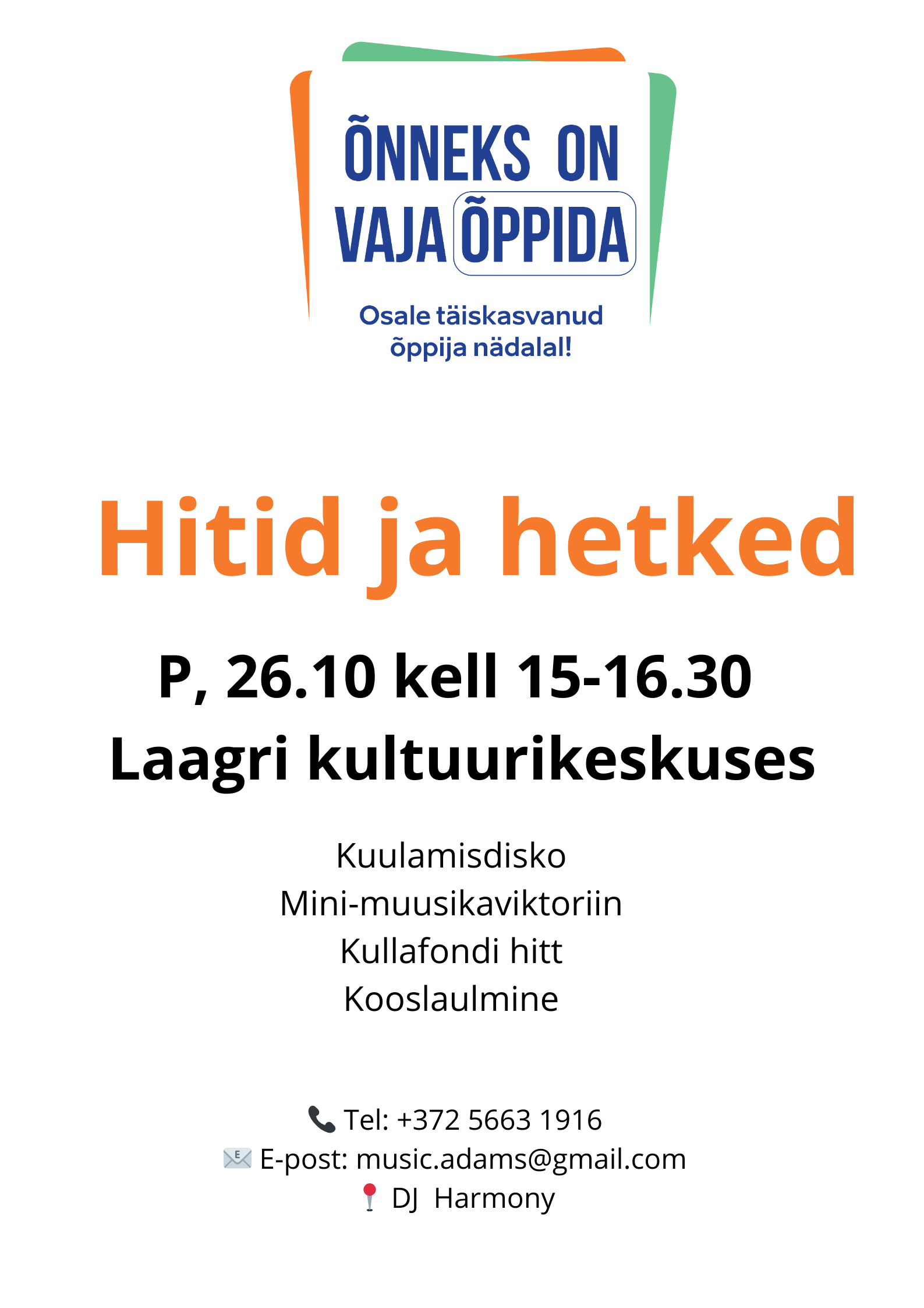 Tule osa saama uuest täiskasvanutele mõeldud muusikaõhtust “Hitid ja hetked”, kus ühendame kuulamisdisko, muusikaviktoriini, kullafondi lugude tutvustuse ja kooslaulmise rõõmu.