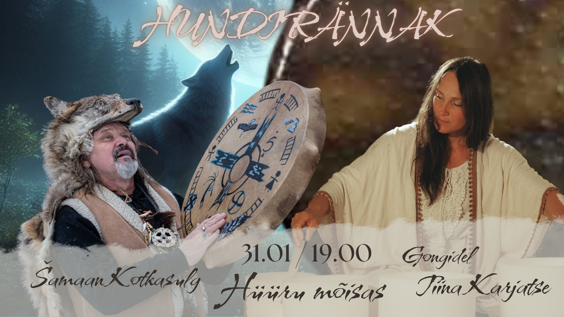 PILET: 35 EUR. Koha saab broneerida ja pileti soetada Fienta piletikeskusest. https://fienta.com/et/samaan-kotkasulg-ja-tiina-karjatse-hundirannak Koha broneerimine on vajalik, sest sündmusel osalejate arv on piiratud.