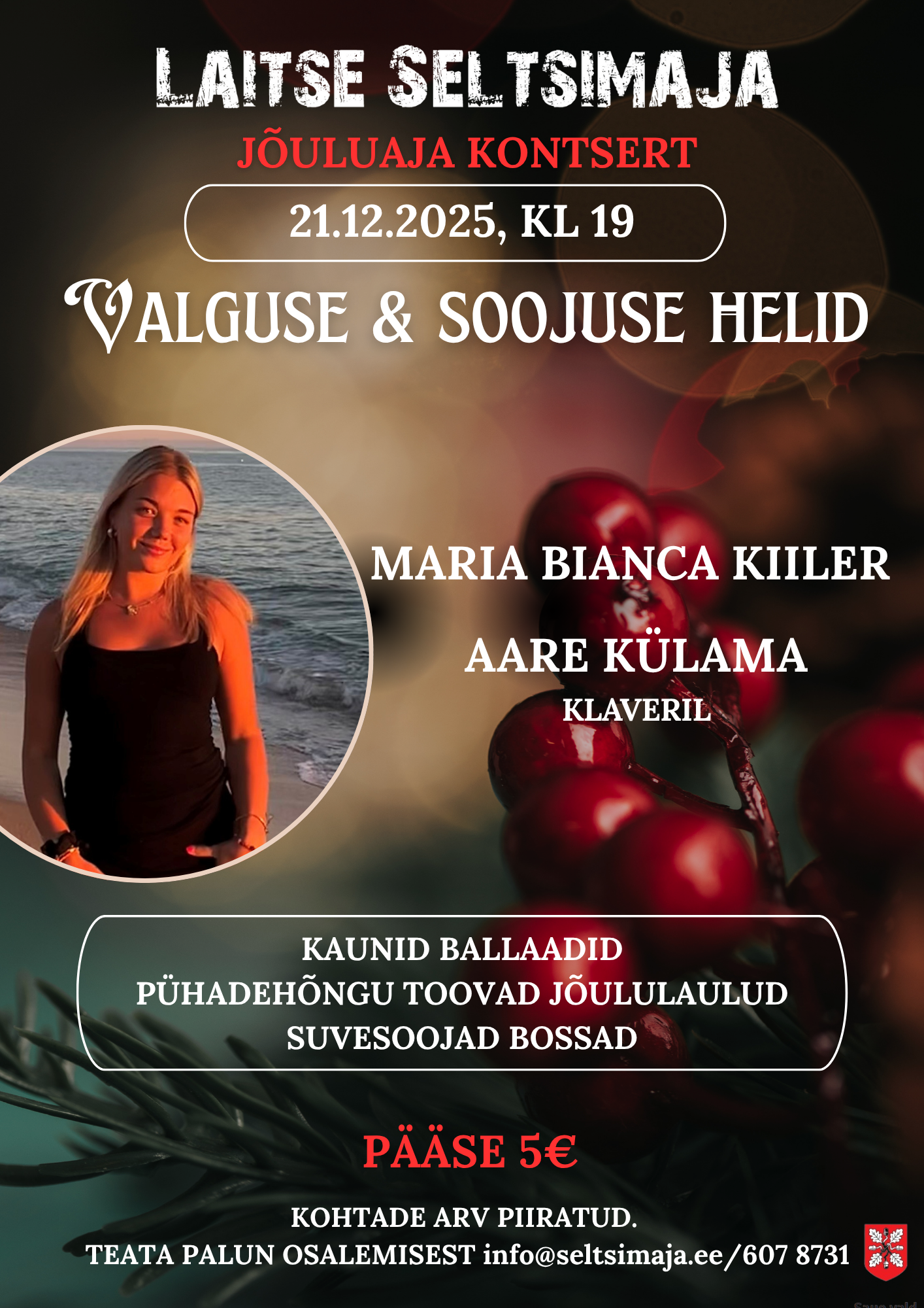 5Õdusat kontserdielamust Laitse Seltsimajas pakuvad vokaal: Maria Bianca Kiiler ja klaver: Aare Külama (Estonian Voices). Esitamisele tulevad kaunid ballaadid, jõuluhõngu toovad palad ning suvesooja bossad. Oled oodatud nautima!