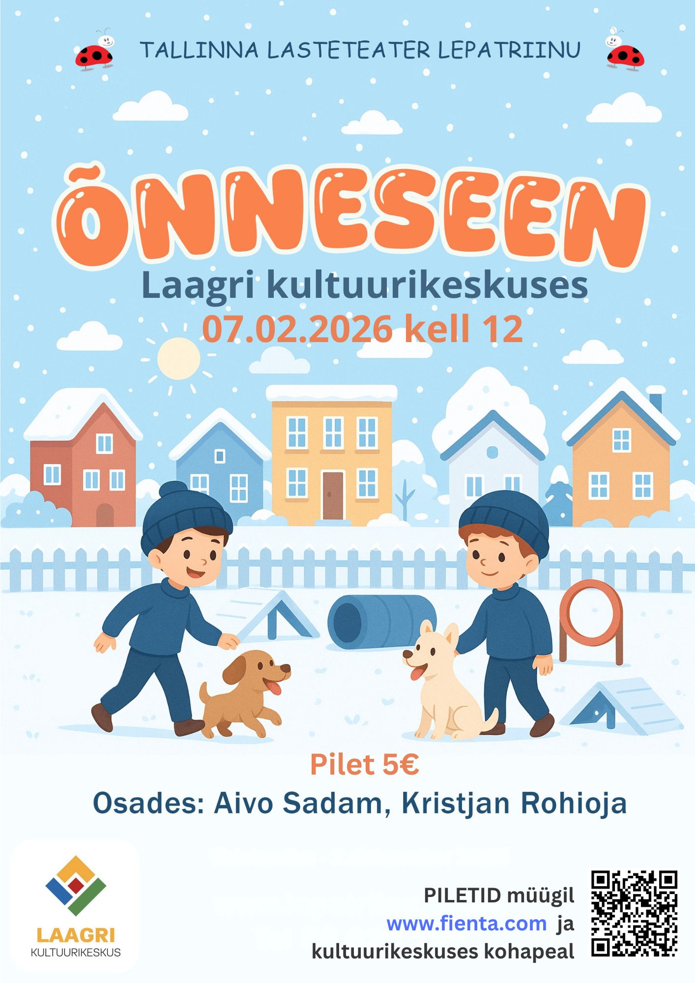 5 €Tallinna Lasteteater Lepatriinu etendus „Õnneseen“ on lugu lemmikloomast, kes on pere poolt hüljatud, kes hulgub õnnetult ja sihitult ringi. Samal ajal on üks poiss, kes soovib endale lemmiklooma. Kuidas ja kas nende teed ristuvad ning see, mis seal sündima hakkab, jäägu esialgu saladuseks, aga kindlasti on seal laulu ja tralli ning nalja ja naeru! Etendus sobib nii tillukestele, kui ka juba pisut suurematele vaatajatele.