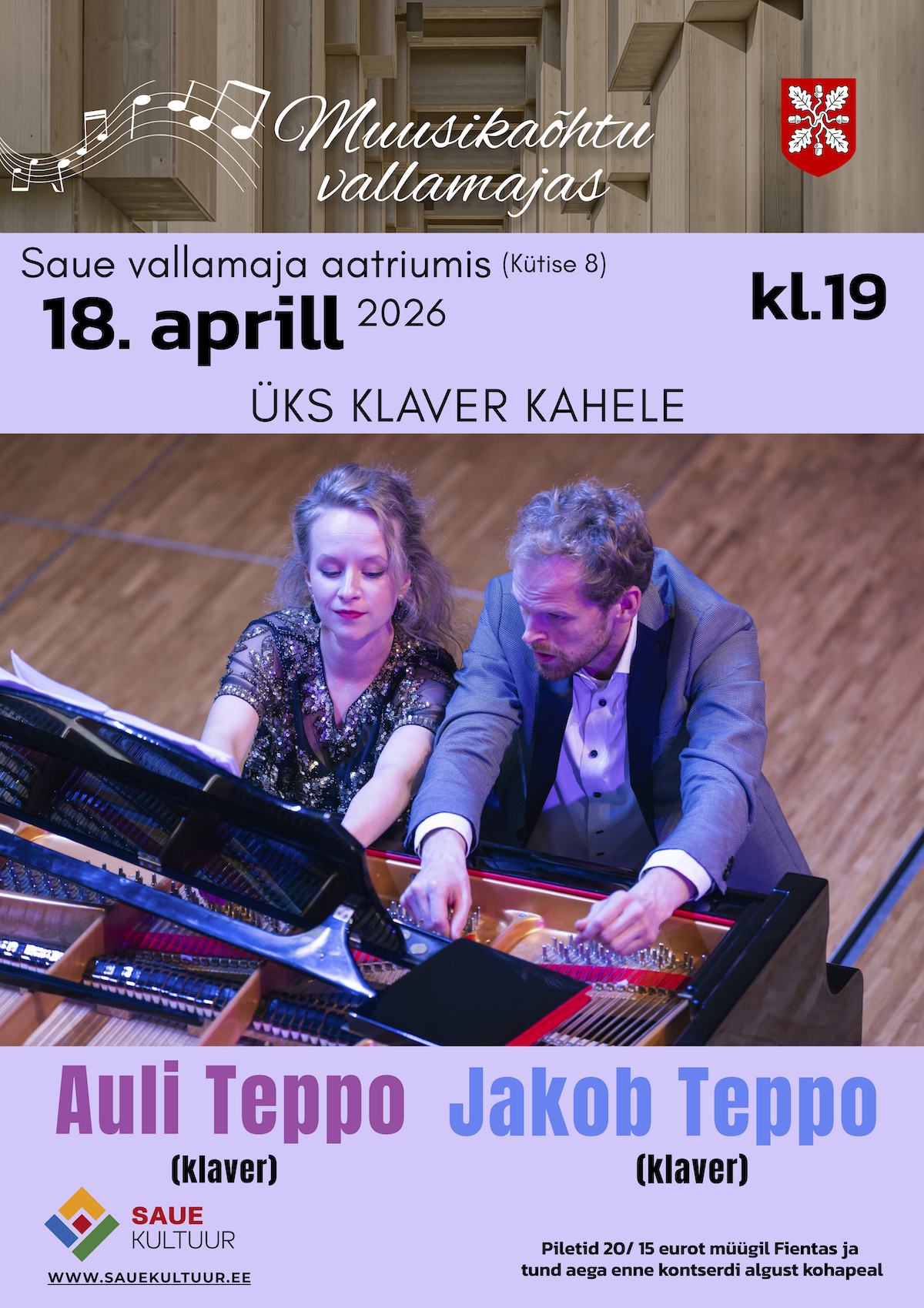 18. aprillil ootame külalisi Saue vallamaja aatriumisse, kus toimub taas muusikaõhtu vallamajas kontsert. Sel korral astuvad lavale Auli ja Jakob Teppo, et koos panna kõlama üks tiibklaver.