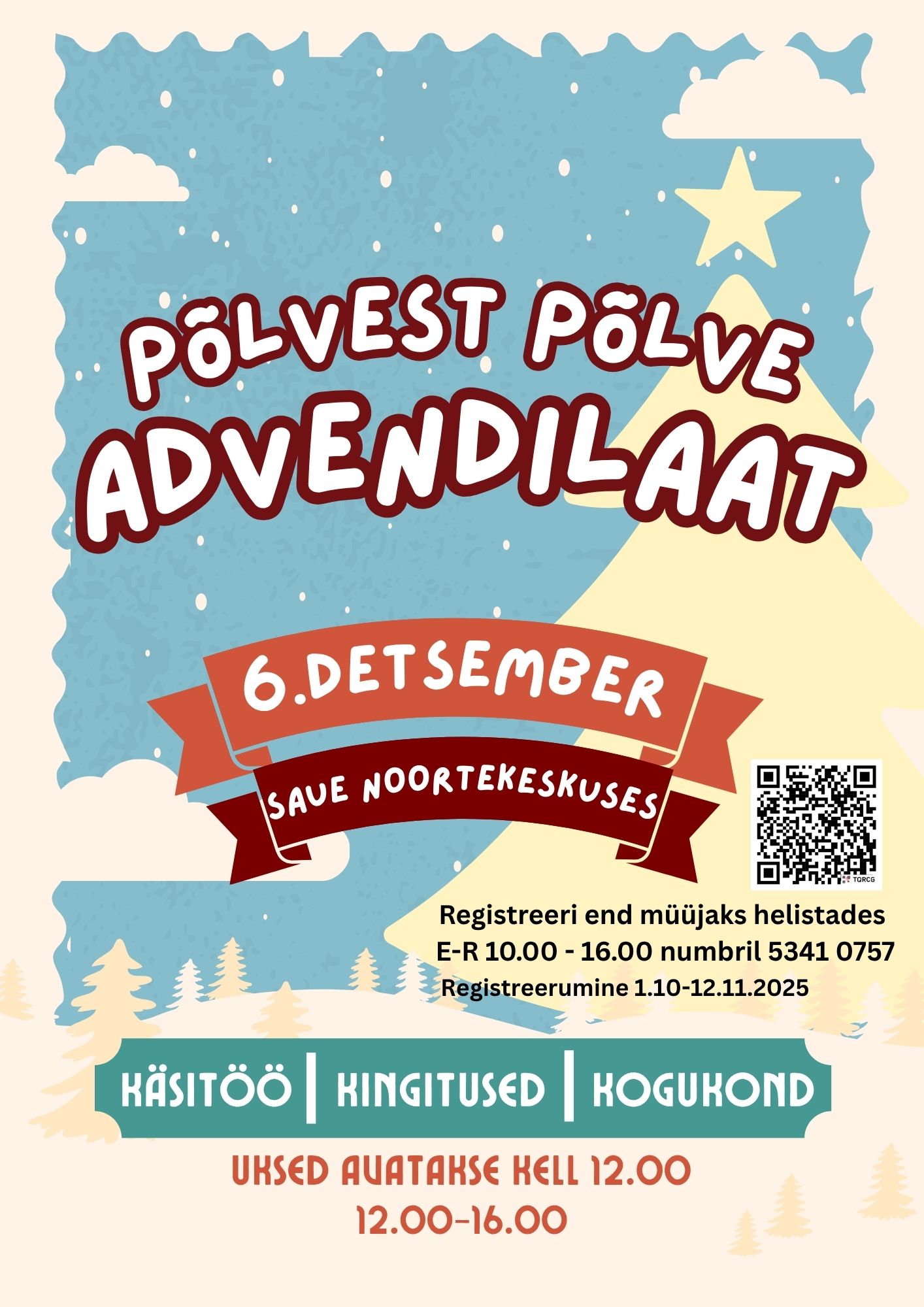 TasutaSaue Noortekeskus ja Saue Sotsiaalkeskus kutsuvad kõiki noori ja väärikaid advendilaadale oma toodangut müüma!