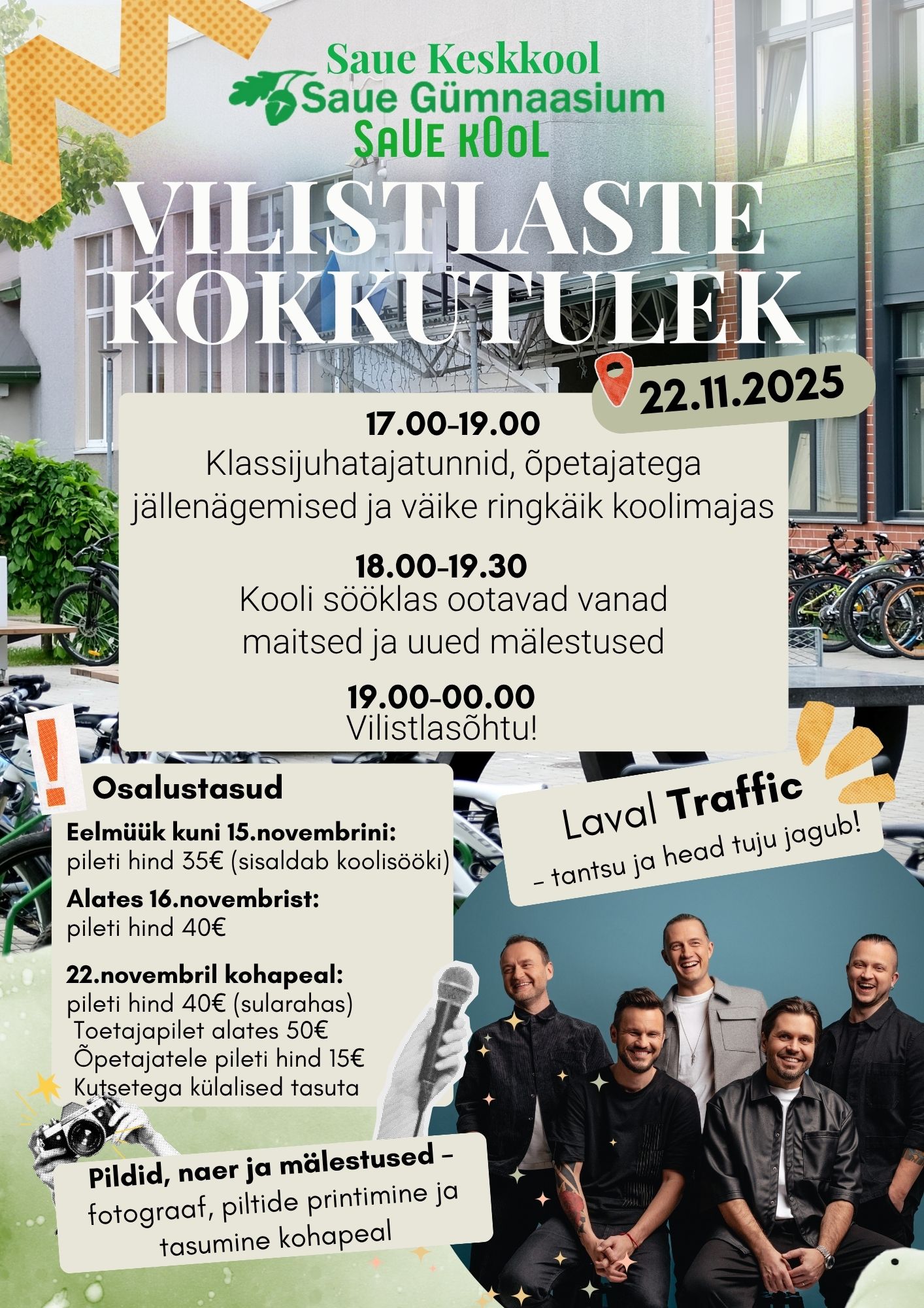 - Vilistlasõhtu toimub laup. 22.nov. kell 17.00 – 00.00 Saue Koolis, Saue Spordihoones, Nurmesalu 9, Saue linn