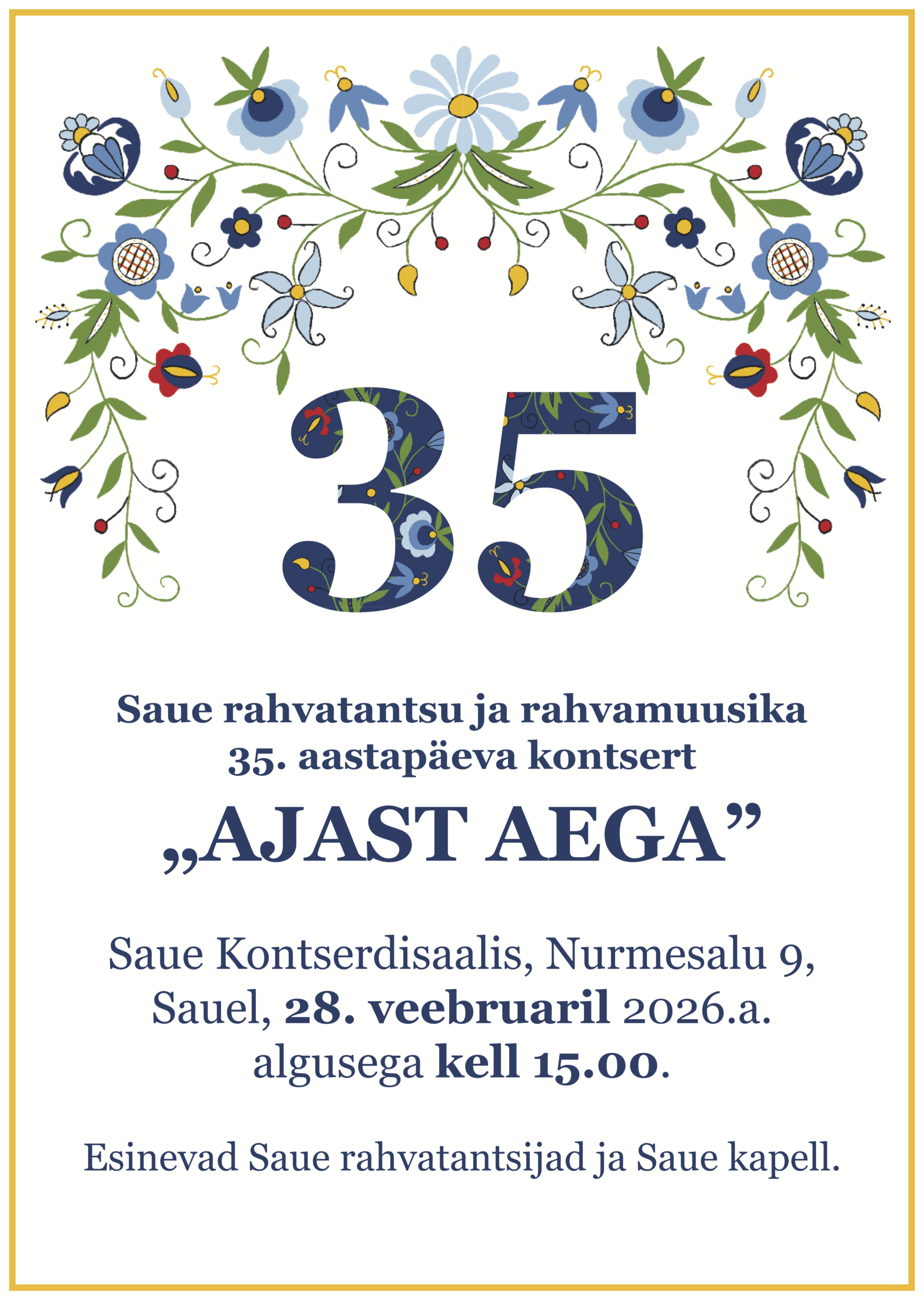 28. veebruaril kell 15.00 ootame kõiki folkloorisõpru Saue Kontserdisaali, et ühiselt tähistada Saue rahvamuusika ja rahvatantsu 35. aastapäeva südamliku kontserdiga “Ajast aega”. Üles astuvad Saue Kapell, Saue Simmajate segarühm ning külalised lähemalt ja kaugemalt. Päeva juhib Meelis Kompus.